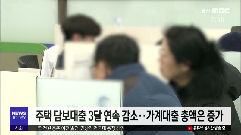 ◀ANC▶ 주택담보대출은 석달 연속 줄어들고 있지만 가계대출 총액은 증가했습니다. 울주군 용암 일반산단이 내년도 국토부의 산업단지 지정계획에 반영됐습니다. 경제브리핑, 김문희 기자입니다. ◀END▶ ◀VCR▶ 울산 지역 주택담보대출이 석 달 연속 감소세를 이어갔지만, 가계 대출 총액은 오히려 늘어난 것으로 나...