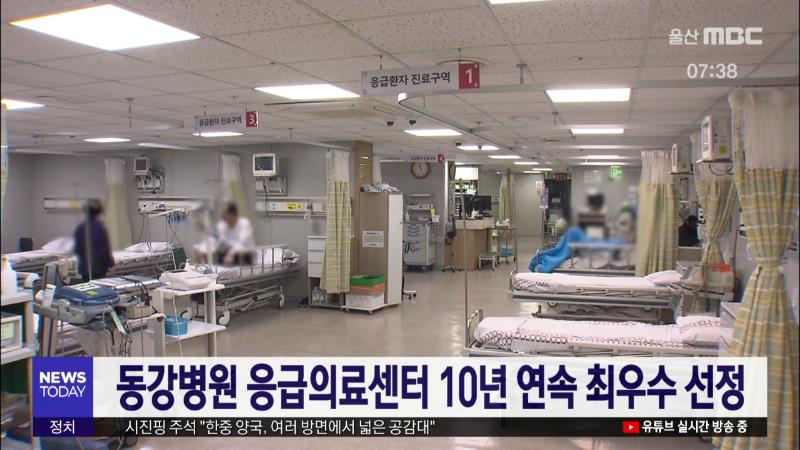 중앙응급의료센터가 실시한 2019년 전국 응급의료기관 평가에서 동강병원이 10년 연속 최우수기관으로 선정됐습니다. 동강병원은 이번 평가에서 전국 112개 지역응급의료센터 가운데 상위 A등급 30% 안에 해당되는 100점 만점에 93.27점을 받았다고 밝혔습니다. //
