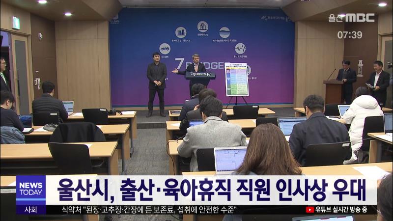 울산시와 울산시공무원노조는 오늘(12/23) 시청에서 '아이 낳고 키우기 좋은 직장 만들기 업무협약'을 체결했습니다. 시는 전국 최초로 근무성적평정을 할 때 육아휴직 중인 공무원이 불이익을 받지 않도록 상위 60% 이상의 점수를 주기로 했습니다. 또, 평정 기간 중 자녀를 출산하는 공무원에게 첫째 자녀 0.5점, 둘째 1...