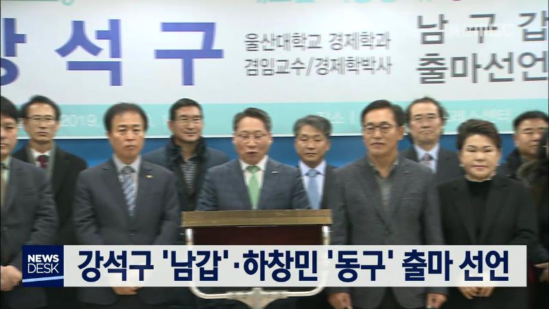 강석구 바른미래당 전 울산시당위원장은 오늘(12/23) 시의회 프레스센터에서 기자회견을 열고 내년 총선 남구 갑 출마를 선언했습니다. 강 전 위원장은 전 북구청장과 시의원, 30여 년 동안 기업을 운영한 경험을 토대로 침체된 지역 경제를 살리는 데 앞장서겠다고 포부를 밝혔습니다. 하창민 노동당 울산시당위원장은 동...