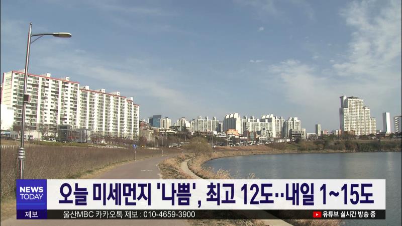 울산은 오늘(12/24) 고기압의 가장자리에 들면서 구름이 많다가 늦은 오후부터 차차 맑아지겠습니다. 오늘 낮 최고 기온은 12도로 예상돼 어제와 비슷하겠습니다. 지난 19일부터 건조주의보가 내려진 가운데 오늘 미세먼지 농도가 나쁨 수준을 보이겠습니다. 성닽절인 내일은 대체로 맑다가 아침부터 차차 흐려지겠으며 기...