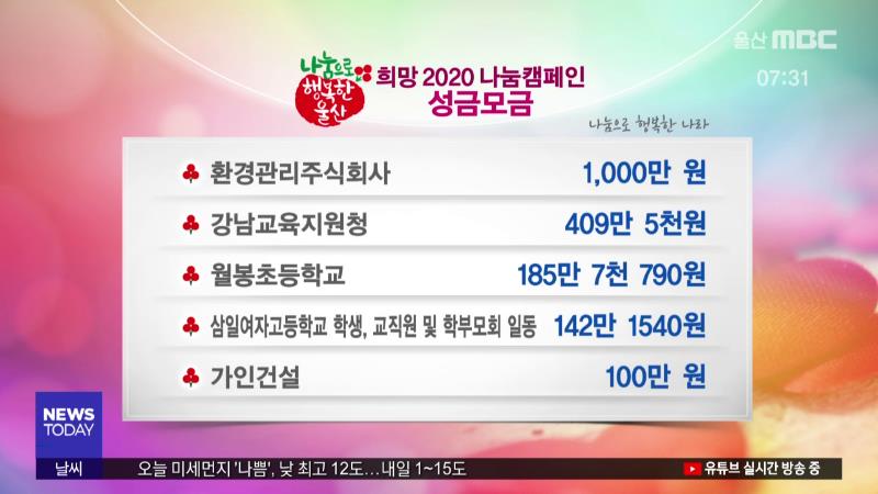 다음은 '희망 2020 나눔캠페인'에 참여해주신 분입니다. ------------------------------------------- 고려아연 10억 원 울산지방변호사회 3,000만 원 SKC㈜ 2,887만 9천 277원 대한전문건설협회 1,493만 7천원 티에스케이워터 1,000만 원 환경관리주식회사 1,000만 원 강남교육지원청 409만 5천원 월봉초등학교 185만 7천...