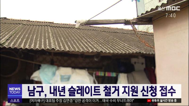 남구는 노후화된 슬레이트에서 발생하는 석면으로 인한 피해를 줄이기 위해 내년 2월 28일까지 슬레이트 처리 지원 사업을 추진합니다. 주택 슬레이트 철거에는 가구당 최대 344만 원, 지붕개량에는 427만원, 창고 등 비주택 슬레이트 철거에는 172만원을 지원합니다. 슬레이트 처리를 희망하는 주민은 가까운 행정복지센터...