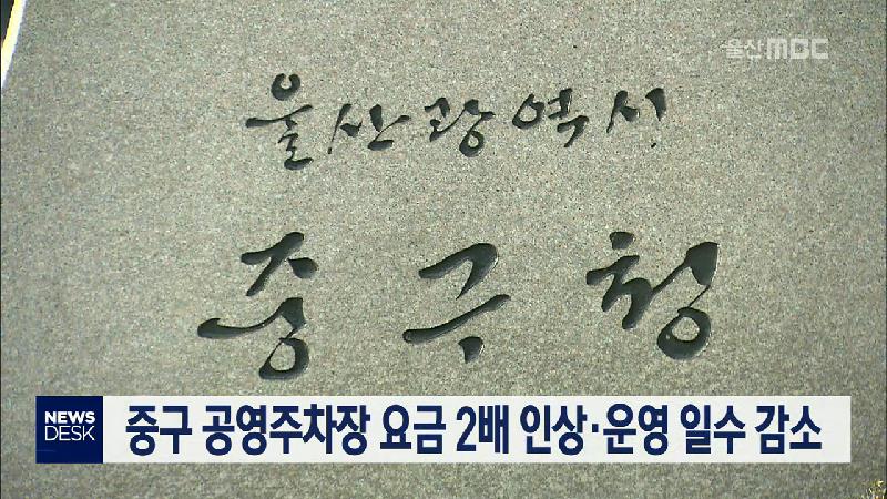 내년부터 중구 지역 공영·노상주차장의 이용 요금과 운영 일수가 조정됩니다. 중구청은 태화강국가정원과 십리대밭 먹거리, 학성로, 약사복개천 등 중구지역 공영주차장 8곳, 724면의 유료 운영일수를 주 6일에서 주 4일로 조정한다고 밝혔습니다. 대신 요금은 기본 30분 250원에서 500원으로 하루 주차요금은 5천원에서 1...