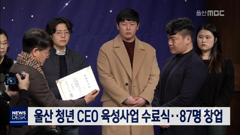 2019년 청년 CEO 육성사업 10기 수료식이 오늘(12/20) 울산대학교 산학협동관에서 열렸습니다. 10기 청년 CE0들은 지난 3월부터 최근까지 10개월간 창업과 사업화 지원 프로그램을 이수해, 창업 87명, 지식재산권 등록 8건, 매출액 13억9천만 원의 성과를 거둔 것으로 집계됐습니다. 울산시는 올해로 10기를 맞은 청년 CEO ...