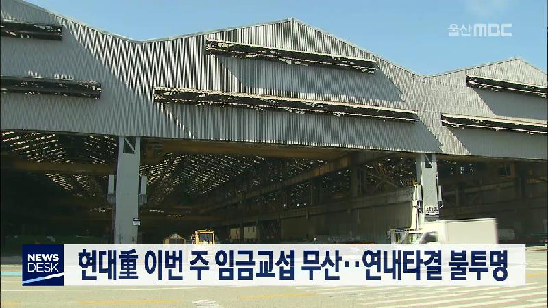 현대중공업 노사의 올해 임금협상 교섭이 잇따라 무산되면서 연내 타결이 어려울 것이란 전망이 나오고 있습니다. 노사는 지난 주 회사의 임금 제시안을 노조가 반려하면서 교섭을 잠정 중단했고 이번 주 예정됐던 35차와 36차 교섭도 모두 열리지 않았습니다. 늦어도 다음 주 중에는 잠정합의안이 나와야 연내 타결이 가능...