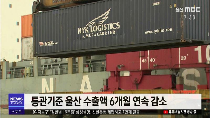 ◀ANC▶ 울산 세관의 통관기준 수출액이 6개월 연속 감소했습니다. 울산 지역 아파트값는 13주 연속 올랐지만 내년도 공시가격은 소폭 하락했습니다. 경제브리핑, 이돈욱 기자입니다. ◀END▶ ◀VCR▶ 자동차 수출 호조세 속에서도 통관 기준 울산 지역 수출액은 5개월 연속 감소한 것으로 나타났습니다. 울산세관에 따...