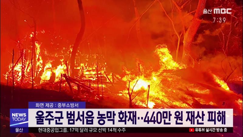 어제(12/19) 저녁 7시 23분쯤 울주군 범서읍 굴화리 한 농막에서 화재가 발생해 주변 임야와 과실수 등을 태워 440여만 원 상당의 재산 피해를 낸 뒤 1시간여 만에 진화됐습니다. 소방당국은 쓰레기를 소각하다 잠시 자리를 비운 사이 불이 인근으로 번졌다는 농막 주인의 진술을 토대로 정확한 화재 원인을 조사하고 있습...