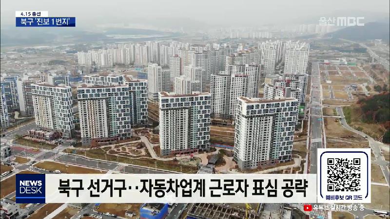 ◀ANC▶ 내년 4.15 총선 출마를 준비하는 후보들을 알아보는 연속 기획, 오늘은 북구입니다. 과거 북구는 노동자들이 밀집해 진보정치 1번지로 불렸는데, 최근 대단지 아파트 공급으로 인구가 늘면서 표심을 읽기 어렵다는 분석이 지배적입니다. 그리고 지금 화면에는 QR 코드가 떠 있는데요, QR코드를 읽으면 곧바로 울산...