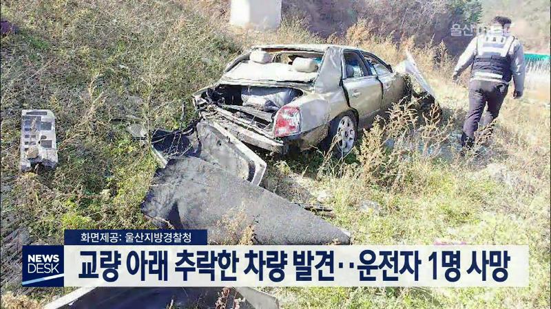오늘(12/19) 오전 10시 40분쯤 울주군 서생면 화정리 31번 국도 화정교 아래에 승용차 한대가 추락해 있는 것을 산불관리원이 발견해 경찰에 신고했습니다. 출동한 경찰은 사고 차량과 10여 미터 떨어진 곳에서 운전자 30대 A씨가 숨져 있는 것을 확인했습니다. 경찰은 A씨가 부산 기장군에서 울주군 방면으로 운전하다 가...