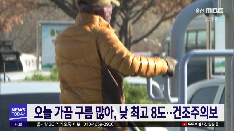 울산은 오늘(12/20) 고기압의 영향으로 가끔 구름이 많겠습니다. 오늘 낮 최고 기온은 8도로 예상돼 어제보다 2도 정도 낮겠습니다. 내일은 고기압의 가장자리에 들면서 구름이 많은 가운데 기온은 아침 최저 영하 2도 낮 최고 9도의 분포를 보이겠습니다. 어제부터 건조주의보가 발효된 울산은 당분간 매우 건조한 상태가 ...