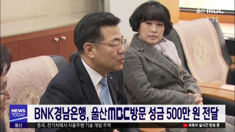 BNK경남은행 김갑수 영업본부장은 오늘(12/17) 울산MBC를 방문해 불우이웃 돕기에 써 달라며 성금 500만 원을 전달했습니다. BNK경남은행은 매년 연말마다 각 언론사를 방문해 성금을 기탁하고 있으며, 우리 주변의 불우한 이웃들에게 따뜻한 희망과 용기를 전달하고 싶다는 뜻을 밝혔습니다.//