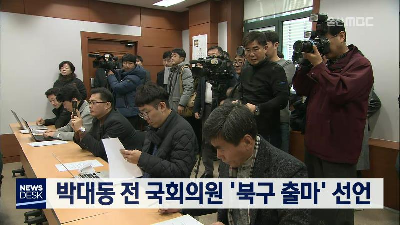 자유한국당 박대동 전 국회의원은 오늘(12/17) 시의회 프레스센터에서 기자회견을 열고 내년 총선에 북구 출마를 선언했습니다. 박대동 전 의원은 송정역 활성화와 울산외곽순환도로 등 도시 인프라 확충을 통해 사람이 모이는 살기 좋은 북구를 만들겠다는 포부를 밝혔습니다.//