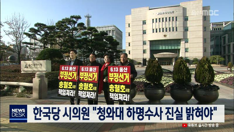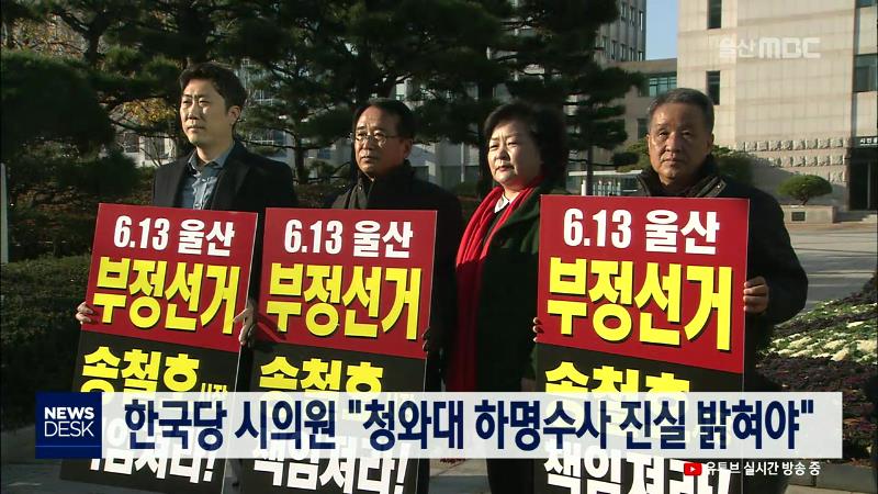 울산시의회 자유한국당 시의원들이 청와대 하명수사의 진실을 밝혀야 한다며 오늘(12/16)부터 울산시청 앞에서 피켓 시위를 시작했습니다. 한국당 시의원들은 지난해 6.13 지방선거를 앞둔 시점에 김기현 한국당 시장 후보가 경찰 수사를 받아 구청장과 시·구·군 모두 지지도가 급락했다고 주장하며, 송철호 시장이 진실을 ...