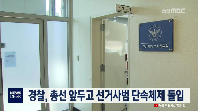 울산지방경찰청은 내년 4월15일 실시되는 제21대 국회의원 선거를 앞두고 본격적인 선거사범 단속체제에 돌입합니다. 경찰은 오늘(12/16)부터 모든 경찰서에 선거사범 수사전담반을 편성해 각종 불법행위에 대한 첩보 수집을 강화합니다. 경찰은 또 SNS 등을 통한 가짜뉴스 유포와 선거관리위원회·정당 홈페이지 해킹, 디도...