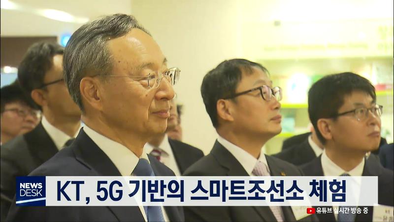 KT 임원진이 울산 현대중공업에서 '5G 기반의 스마트조선소 체험' 행사를 가졌습니다. 황창규 KT 회장을 비롯한 임원진 20여 명은 360도 웨어러블 넥밴드를 착용한 구조 사례를 설명받고, 모바일 기반의 통합관제모니터링와 대용량 3D 도면 다운로드 등을 점검했습니다. KT와 현대중공업지주는 지난 5월 5G 기반 로봇·스마...