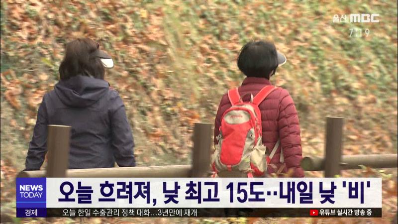 울산은 오늘(12/16) 고기압의 가장자리에 들면서 구름이 많다가 차차 흐려지겠습니다. 오늘 낮 최고 기온은 15도로 어제보다 4도 정도 높겠습니다. 내일은 기압골의 영향을 받으면서 흐리다 낮 한때 5~10mm의 비가 내리겠으며, 기온은 아침 최저 6도, 낮 최고 16도의 분포를 보이겠습니다. 지난 12일 건조주의보가 발효된 ...