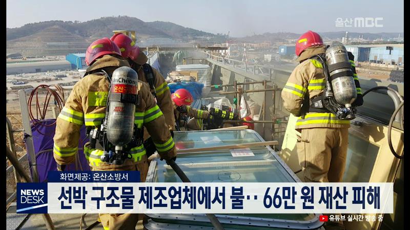 오늘(12/14) 오전 11시 5분쯤 울주군 온산읍 우봉리의 한 선박 구조물 제조업체에서 불이 나 전선 배관 등을 태워 소방서 추산 66만 원의 재산 피해를 내고 40분 만에 꺼졌습니다. 소방당국은 선박 내 전선 케이블이 들어있는 곳에서 불이 발생한 것으로 보고 화재 발생 원인을 조사하고 있습니다. //