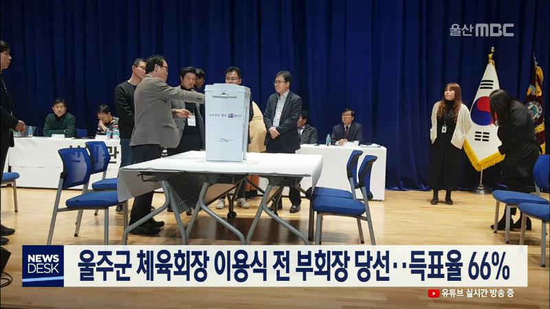 오늘(12/14) 치러진 울주군 체육회장 선거에서 이용식 전 울주군체육회 부회장이 119표를 얻어 득표율 66%로 당선됐습니다. 박의남 전 울주군 주민자치협의회장은 62표를 받으며 득표율 34%에 그쳤습니다. 다음달 5일에는 동·북구체육회, 7일 시체육회, 11일 남구체육회, 13일 중구체육회 선거가 예정돼 있습니다//