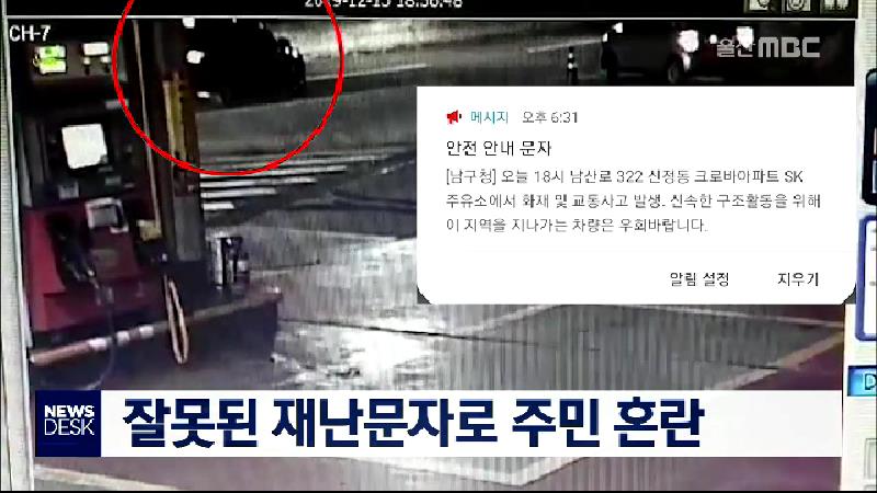 오늘 오후 6시쯤 남구 신정동의 한 주유소에서 교통사고와 화재가 발생했다는 재난문자가 발송돼 소방차가 출동하고 인근 주민들이 대피하는 등 혼란이 발생했습니다. 경찰은 도로를 달리던 승용차가 연석을 들이받으면서 그 충격으로 에어백이 터지고 연기가 발생했을 뿐이라고 밝혔습니다. 남구청은 30분이 지나서야 정정...