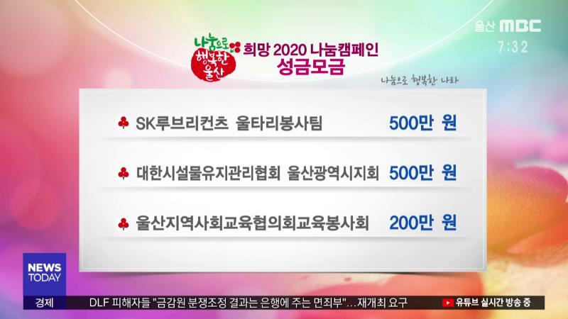 다음은 '희망 2020 나눔캠페인'에 참여해주신 분입니다. ------------------------------------------- SK루브리컨츠 울타리봉사팀 500만 원 대한시설물유지관리협회 울산광역시지회 500만 원 울산지역사회교육협의회교육봉사회 200만 원 문수로아이파크입주자대표회의 100만 원 울산광역시 재향소방동우회 50만 원 동서석...