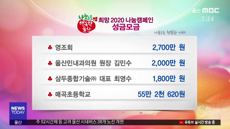 다음은 '희망 2020 나눔캠페인'에 참여해주신 분입니다. ------------------------------------------- 영조회 2,700만 원 울산민내과의원 원장 김민수 2,000만 원 삼두종합기술㈜ 대표 최영수 1,800만 원 매곡초등학교 55만 2천 620원 -------------------------------------------을 기탁하셨습니다. -------------------...