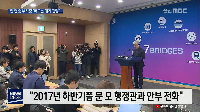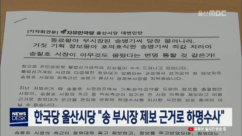 자유한국당 울산시당 대변인단은 오늘(12/5) 시의회 프레스센터에서 기자회견을 열어 청와대 비위 첩보 최초 제보자로 지목된 송병기 울산시 경제부시장을 비난했습니다. 이들은 송철호 시장의 핵심 측근이 김기현 전 시장 의혹을 제보하고 청와대가 이를 근거로 경찰에 하명 수사를 지시했다고 주장했습니다. 또, 송철호 ...
