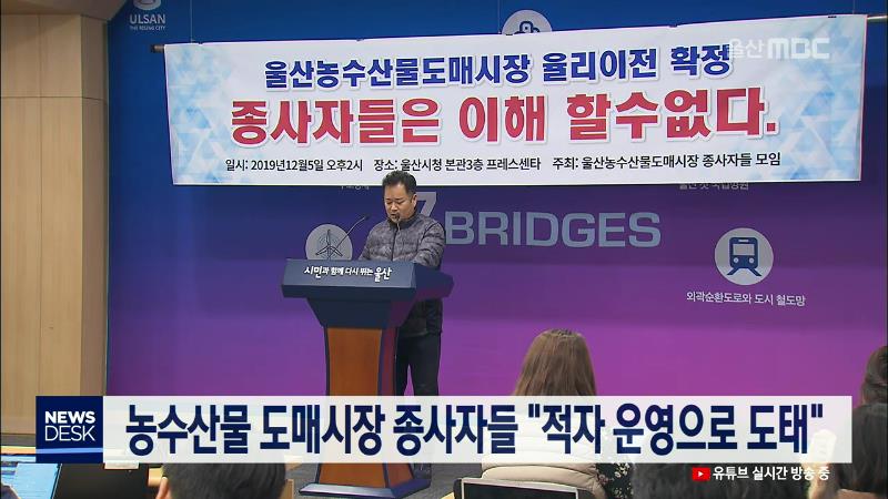 울산농수산물 도매시장 종사자 모임은 오늘(12/5) 시청에서 기자회견을 열고 농수산물 도매시장의 이전 부지가 율리로 결정된 것에 대해 울산시의 명쾌한 설명이 없다면 수용하기 어렵다고 밝혔습니다. 이들은 울산농수산물도매시장은 산지형이 아닌 소비자형으로, 시장이 도심 외곽인 율리로 이전할 경우 도매시장의 적자 ...