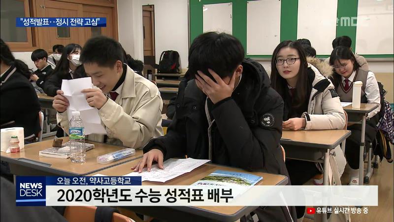 ◀ANC▶ 2020학년도 수능 성적표가 오늘(12/4) 수험생들에게 배부됐습니다. 수학 '나'형과 국어가 어려웠다는 분석 속에 정시 경쟁률과 합격선 하락도 예상돼 내 점수에 맞는 수능 반영 조합을 찾는 전략 마련이 중요해졌습니다. 이돈욱 기자입니다. ◀END▶ ◀VCR▶ 수험번호 순서대로 부를 테니까 나오셔서 확인하시면...