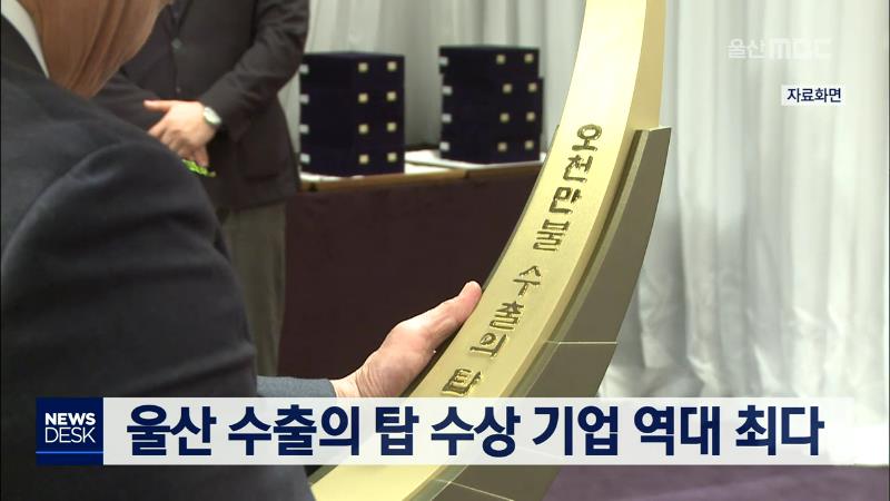 내일(12/5) 무역의 날을 맞아 울산 지역 역대 최다인 43개 기업이 수출의 탑을 수상합니다. 롯데정밀화학이 6억불탑을 송원산업이 4억불탑을 수상하며 2개 기업이 억대 수출의 탑을 받는 가운데, 백만불 탑 수상 기업도 21개로 역대 최다를 기록했습니다. 울산지역 무역의 날 행사는 오는 12일 열릴 예정입니다.//