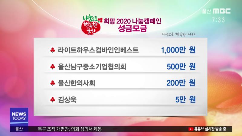 다음은 '희망 2020 나눔캠페인'에 참여해주신 분입니다. ------------------------------------------- 라이트하우스컴바인인베스트 1,000만 원 울산남구중소기업협의회 500만 원 울산한의사회 200만 원 김상욱 5만 원 -------------------------------------------을 기탁하셨습니다. -----------------------------------...