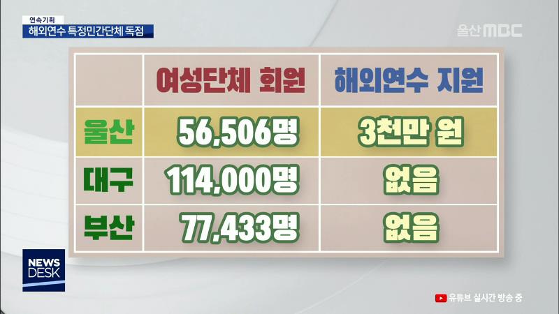 ◀ANC▶ 민간인 해외연수의 문제점을 들여다 보는 연속보도, 오늘은 일부 단체에만 편중된 예산지원 행태를 고발합니다. 울산은 다른 광역시에 비해 유달리 특정 단체에 대한 해외연수비 지원에 관대했는데요, 왜 그럴까요? 서하경 기자입니다. · ◀END▶ ◀VCR▶ 울산시가 올해 농.축산인 단체에 지원한 해외연수비는 ...