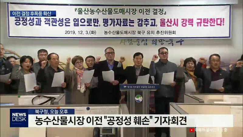 ◀ANC▶ 울산시가 지난달 29일 울주군 청량읍 율리를 농수산물도매시장 최종 이전지로 결정하면서 탈락한 남구와 북구의 반발이 거셉니다. 단 하룻밤 만에, 비공개로 이전 대상지를 결정한 것에 납득 못하겠다는 분위기인데요. 부지 선정 재결정을 위해 법적 대응에 나서겠다고 밝혔습니다. 이용주 기자. ◀END▶ ◀VCR...