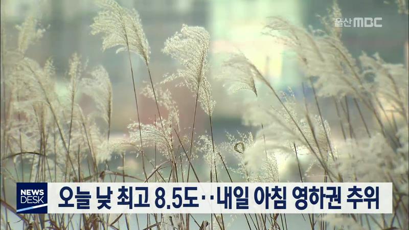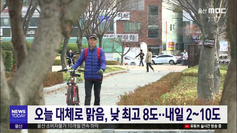 오늘(12/2) 울산지방은 비가 그친 뒤 바람이 강하게 불면서 낮 최고 기온이 8.5도에 머물러 쌀쌀한 날씨를 보였습니다. 내일도 북서쪽에서 찬 공기가 유입되면서 아침기온이 영하 1도까지 내려가 춥겠고, 가끔 구름 많은 가운데 낮 최고 기온은 9도로 예상됩니다. 울산기상대는 당분간 비 소식 없이 대체로 맑은 날씨가 이...