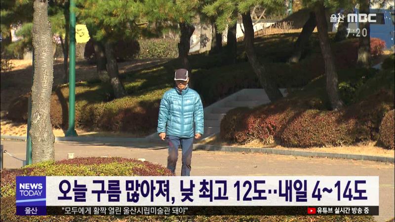울산은 오늘(11/29) 고기압의 영향을 받다가 가장자리에 들면서 맑다가 밤부터 차차 구름이 많아지겠습니다. 낮 최고 기온은 12도로 평년과 비슷한 수준을 보이겠습니다. 토요일인 내일은 구름 많다가 오후부터 흐려지겠으며, 기온은 아침 최저 4도 낮 최고 14도의 분포를 보이겠습니다. 일요일인 모레는 흐리다 저녁부터 5...