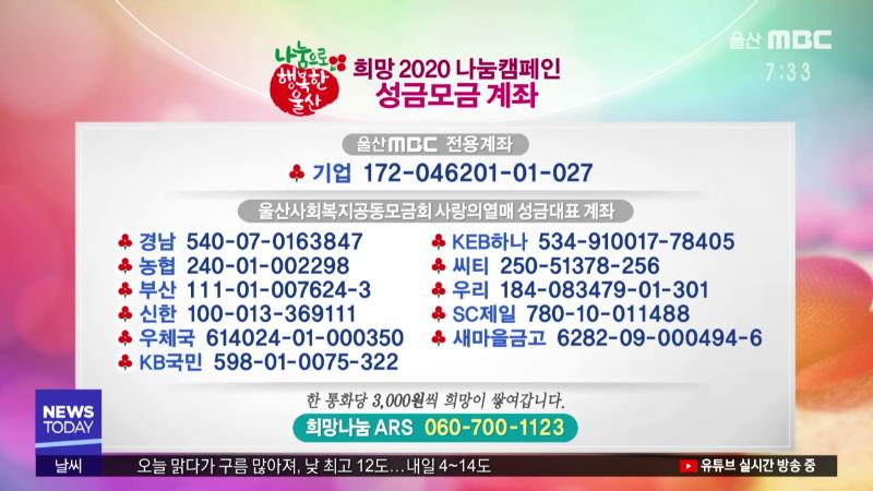 다음은 '희망 2020 나눔캠페인'에 참여해주신 분입니다. ------------------------------------------- 대영교회 2,000만 원 주전초등학교 바자회 성금 70만 원 이륙수산(권명복) 30만 원 -------------------------------------------을 기탁하셨습니다. ------------------------------------------- 성금은 한 통화 3천 ...