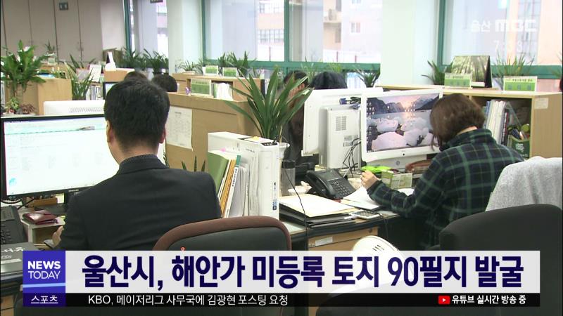 울산시는 미등록 토지 90필지를 찾아내 신규 등록했다고 밝혔습니다. 울산시는 지난 3월부터 해안선을 따라 형성된 미등록 토지를 조사한 결과 90필지, 21만2천 제곱미터의 미등록 토지가 나타났다고 밝혔습니다. 울산시는 해안가에 토지가 자연매립되었거나 해안도로 개설 등으로 새로운 토지가 생겨난 것이라고 설명했습...