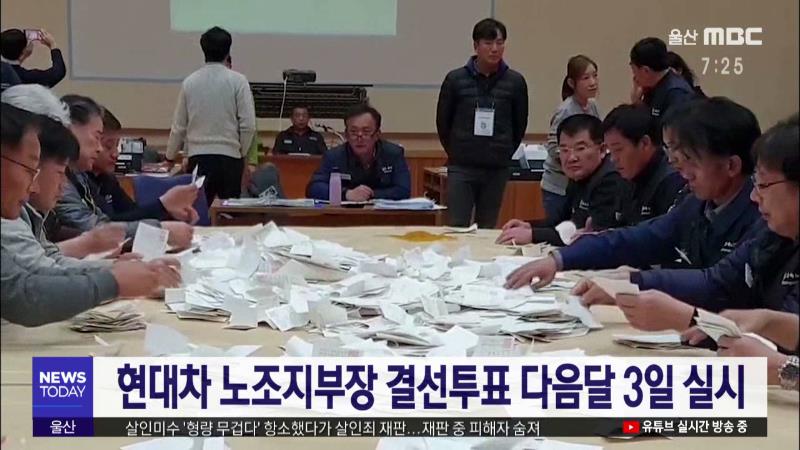 어제(11/28) 실시된 현대자동차 노조 차기 지부장 선거에서 과반수 득표자가 나오지 않아 다음달 3일 1.2위 후보를 대상으로 결선 투표가 실시됩니다. 현대자동차 노조는 개표 결과 기호 3번 이상수 후보 35.7%, 기호 2번 문용문 후보 31.6%의 득표율로 각각 1.2위를 차지했다고 밝혔습니다. 이상수 후보는 실리로, 문용문 ...