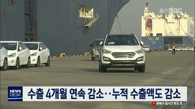 울산의 수출액이 4개월 연속 감소한 가운데 올해 누적 수출액도 감소로 전환했습니다. 한국무역협회 울산본부의 지난달 울산 수출입 동향을 보면 자동차 수출은 14% 늘었지만 석유화학과 선박이 각각 19.9%와 30.3% 감소하며 지난달 수출액이 작년 동월 대비 12.3% 감소한 60억 2천만 달러에 그쳤습니다. 이와 함께 10월까...