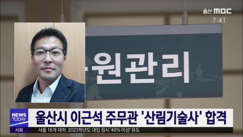 울산시 녹지공원과 이근석 주무관이 '국가기술자격시험 산림기술사'에 최종 합격했습니다. 울산시는 산림 분야 최고 전문가 자격을 획득한 이 주무관이 다양한 실무 경험을 토대로 기술 연구와 자문, 감리, 지도 등의 업무 전문성을 높일 것으로 기대된다고 밝혔습니다.//