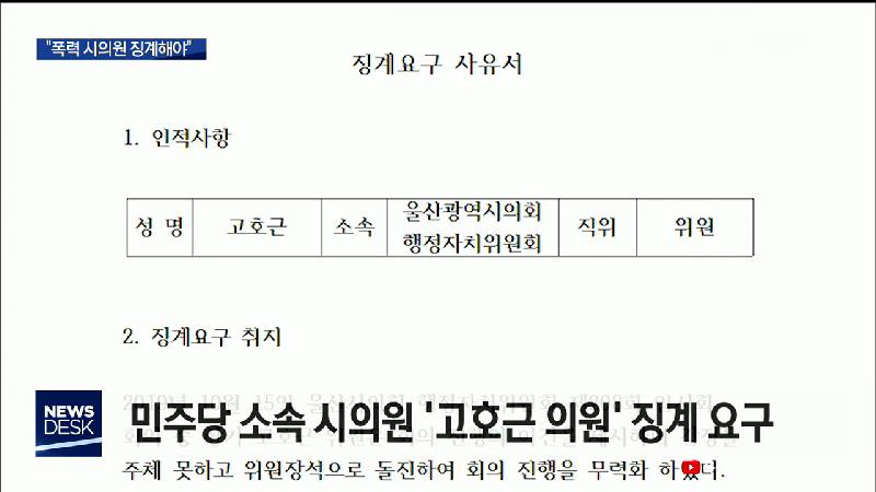 ◀ANC▶ 민주당 울산시당이 기자회견을 열고 강압적인 행동으로 회의 진행을 방해한 한국당 고호근 의원을 맹비난했습니다. 한국당은 주민자치위원장을 폭행해 검찰에 기소까지 된 시의원이 있는데도, 민주당이 제 식구 감싸기에만 열을 올리고 있다고 정면 반박했습니다. 최지호 기자.· ◀END▶ ◀VCR▶ --시의회 회의 ...
