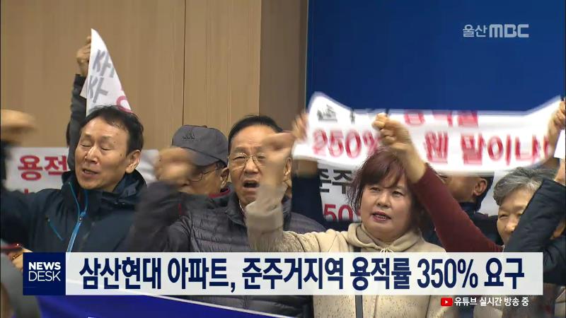 남구 삼산현대아파트 입주민들은 오늘(11/27) 시청에서 기자회견을 열고 준주거지역의 공동주택 용적률도 350%가 되도록 시 조례를 개정해달라고 요구했습니다. 이들은 울주군 상남화창지구 등 용적률 완화 사례가 있다며, 형평성에 맞지 않는다고 주장했습니다. 현재 관련 조례에 따르면 준주거지역의 공동주택은 용적률은...