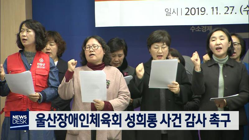 26개 지역 여성 단체로 구성된 울산여성연대는 기자회견을 열고 울산장애인체육회의 여성지도자 성희롱 사건에 대한 철저한 감사를 촉구했습니다. 이에 대해 울산시는 수사기관 접수사건이 아닌 불명확한 '의혹제보'로 피해사실 입증이 곤란했고, 가해자와 피해자 분리를 위해 사직서 수리가 불가피했다고 설명했습니다. //