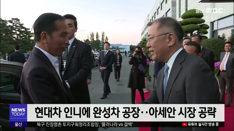 ◀ANC▶ 현대자동차가 인도네시아에 완성차 공장을 짓고 아세안 지역 시장 공략에 나서기로 했습니다. 올들어 자동차 수출은 줄었지만, 수출액은 증가한 것으로 나타났습니다. 경제브리핑, 김문희 기자입니다. ◀END▶ ◀VCR▶ 현대자동차가 인도네시아에 1조8천여 억원을 투자해 아세안 지역에는 최초로 완성차 공장을 ...