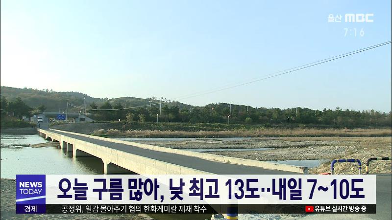 울산은 오늘(11/27)고기압의 가장자리에 들면서 가끔 구름이 많겠습니다. 오늘 낮 최고 기온은 13도로 어제와 비슷하겠습니다. 내일은 동풍의 영향으로 새벽부터 늦은 오후까지 5mm 내외의 비가 내리겠으며, 기온은 아침 최저 7도 낮 최고 10도의 분포를 보이겠습니다. 울산기상대는 내일 새벽 동해남부앞바다에 강한 바람...
