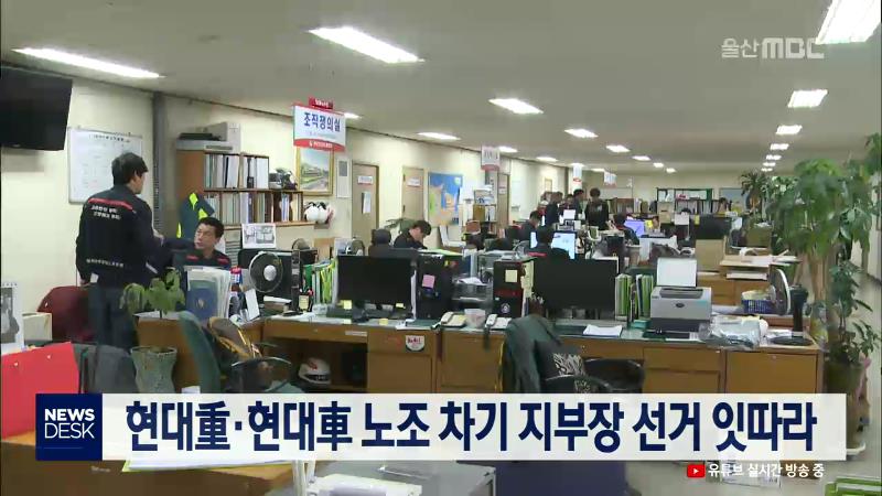 현대중공업과 현대자동차 노조의 차기 지부장 선거가 잇따라 열립니다. 현대중공업 노조는 내일(11\/27) 지부장 선거를 치르는데, 현 집행부 조직의 조경근 후보와 실리 성향의 유상구 후보가 맞대결합니다. 오는 28일 1차 투표를 실시하는 현대자동차 노조의 차기 지부장 선거에는 4명이 후보로 등록했으며, 과반 득표자가...