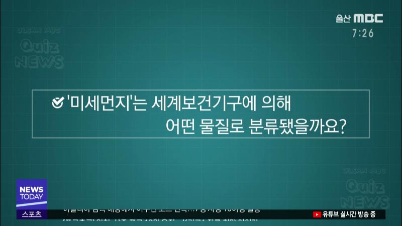 '미세먼지'는 세계보건기구에 의해 어떤 물질로 분류됐을까요? 1 1>1급 발암 물질 2>2급 발암 물질 ----------------- '미세먼지'에 가장 많이 함유된 유해 물질은? 1 1>황산염과 질산염 2>탄소류와 검댕 3>광물 ----------------- '미세먼지' 흡입 차단 마스크는 식약처에서 허가를 받아 ( )가 표기된 보건용을 착용해야 ...