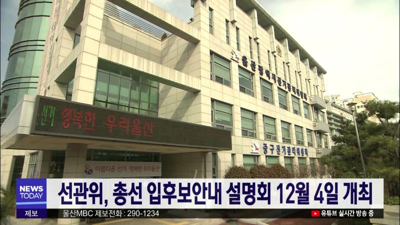 울산시선거관리위원회는 다음 달 4일 오후 2시 대회의실에서 제21대 총선 입후보예정자와 선거사무원을 대상으로 한 설명회를 엽니다. 선관위는 내년 총선 예비후보자 등록일이 3주일 앞으로 다가오면서 등록 절차와 선거운동 방법, 비용 처리, 회계 보고 등을 포괄적으로 안내하고 위법 사례를 설명하는 시간을 준비했다고...