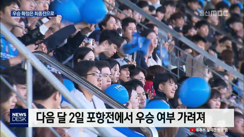◀ANC▶ 오늘 홈에서 열린 전북 현대와의 경기를 잡고 14년 만의 우승을 확정 지으려던 울산 현대가 무승부에 그쳤습니다. 일단 시즌 최종전에서 무승부만 거둬도 우승을 할 수 있는 유리한 고지는 점했습니다. 이돈욱 기자입니다. ◀END▶ ◀VCR▶ 울산 선수들의 몸놀림은 전체적으로 무거웠습니다. 전반 11분 이동국의...