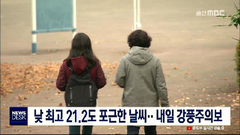 오늘(11\/24) 울산지방은 대체로 흐린 날씨 속에 낮 최고 21.2도를 보이며 평년보다도 7도 이상 높아 포근한 날씨를 보였습니다. 내일도 흐린 가운데 8도에서 11도의 기온분포를 보이며 오전부터 동풍의 영향으로 곳에 따라 5mm 미만의 약한 비가 내리겠습니다. 울산기상대는 내일 바람 차차 강해져 오전부터 강풍주의보가 ...
